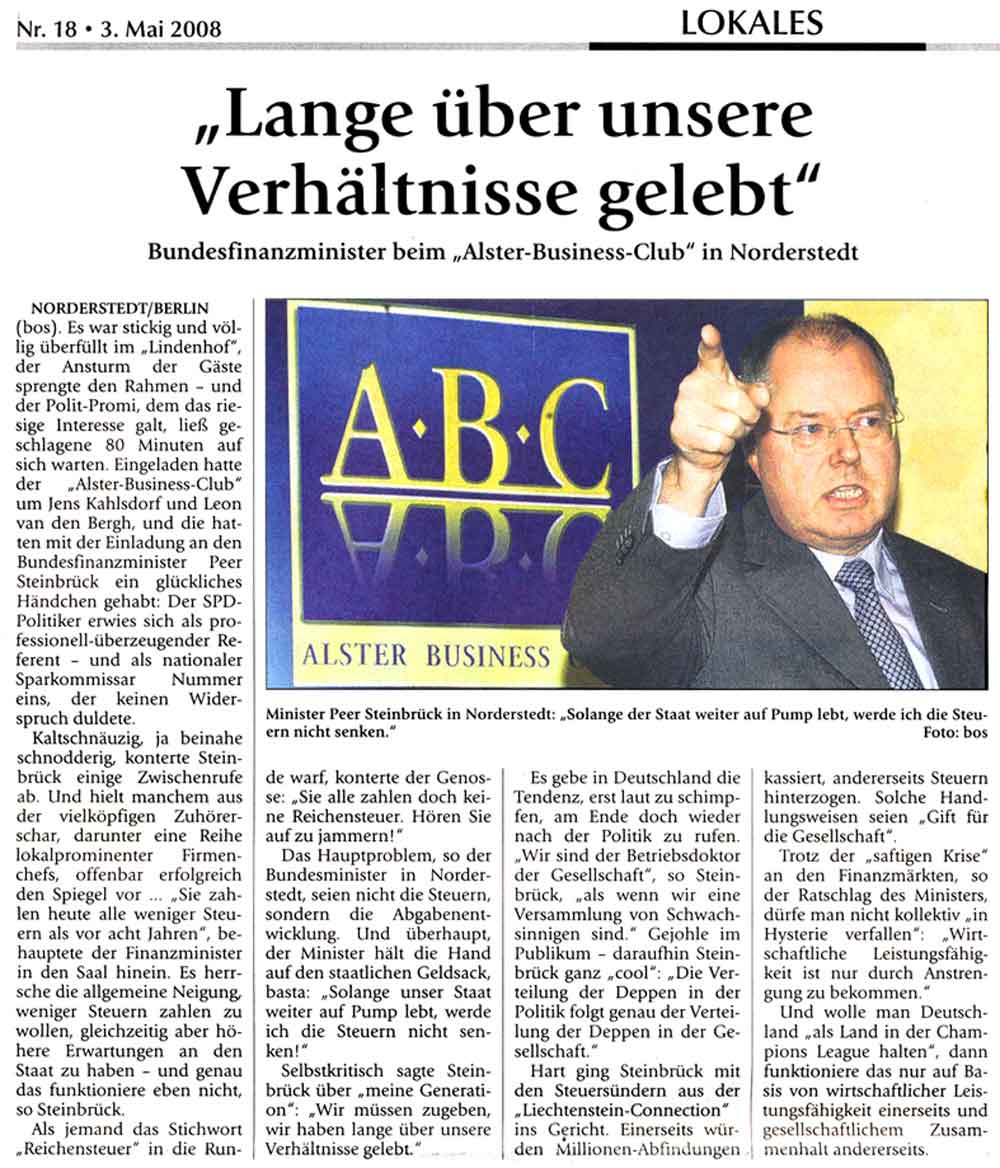 Bundesfinanzminister (a.D.) Peer Steinbrück MdB hält im ALSTER BUSINESS CLUB einen Vortrag (ohne Gage)